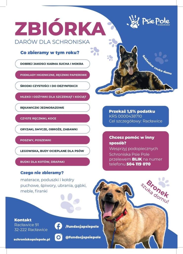Rada Rodziców zaprasza całą społeczność szkolną do udziału w zbiórce darów dla Schroniska Psie Pole. Pudełko na zbierane rzeczy będzie dostępne od poniedziałku rano w szatni szkolnej przy wejściu. Zbiórka trwa do 23.01 do godz. 12.00. Dziękujemy za każde wsparcie!